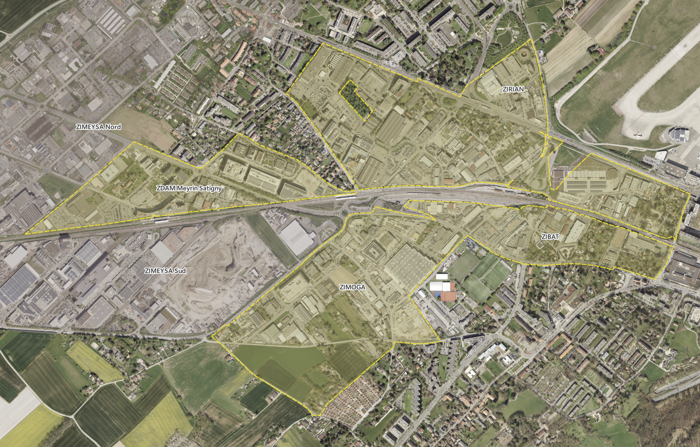 Le périmètre de la zone industrielle des Batailles (ZIBAT), implanté sur le territoire des communes de Vernier et de Meyrin, se caractérise par des contraintes qui structurent fortement son urbanisation et sa densification. Ce territoire est traversé par plusieurs installations soumises à l’ordonnance sur la protection contre les accidents majeurs (OPAM), à savoir un gazoduc, un oléoduc, la voie ferrée et la route du Nant-d’Avril. Le plafond aérien induit par la proximité de l’aéroport rend impossible tout développement vertical d’envergure.